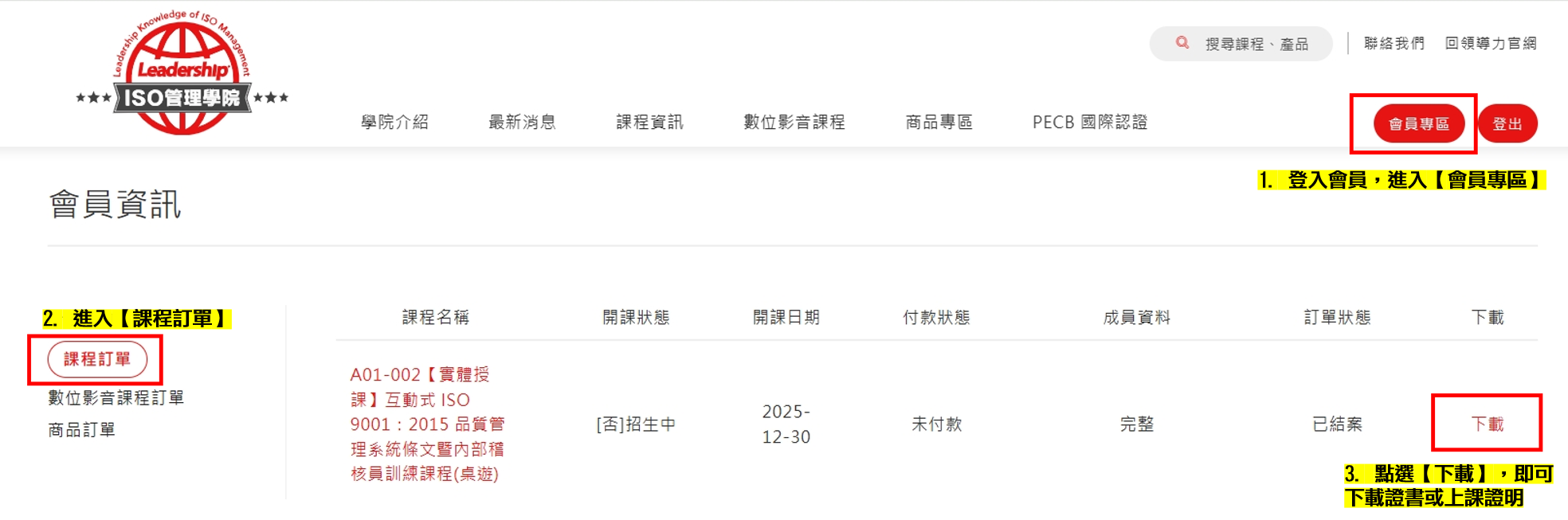 登入當初下訂課程的會員帳號後,進入【會員專區】。