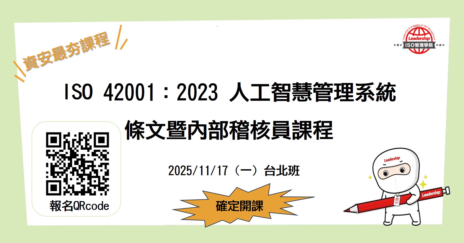 【資安最夯】ISO 42001:2023 人工智慧管理系統 2025/11/17 台北班(確定開課)